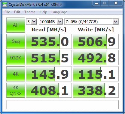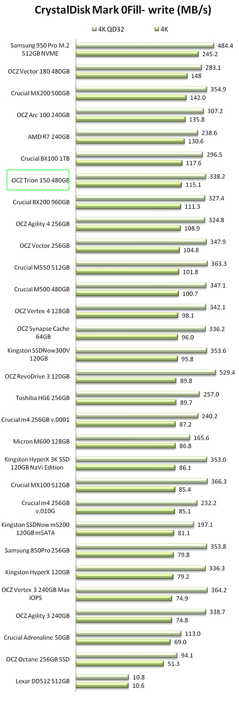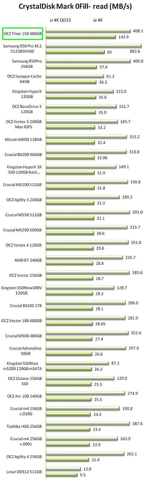 Interestingly, when we ran the test again set to 0Fill mode, the 4K read score shot up from 31.25 MB/s to 143.9 MB/s on the OCZ Trion 150. The rest of the results were practically unchanged: