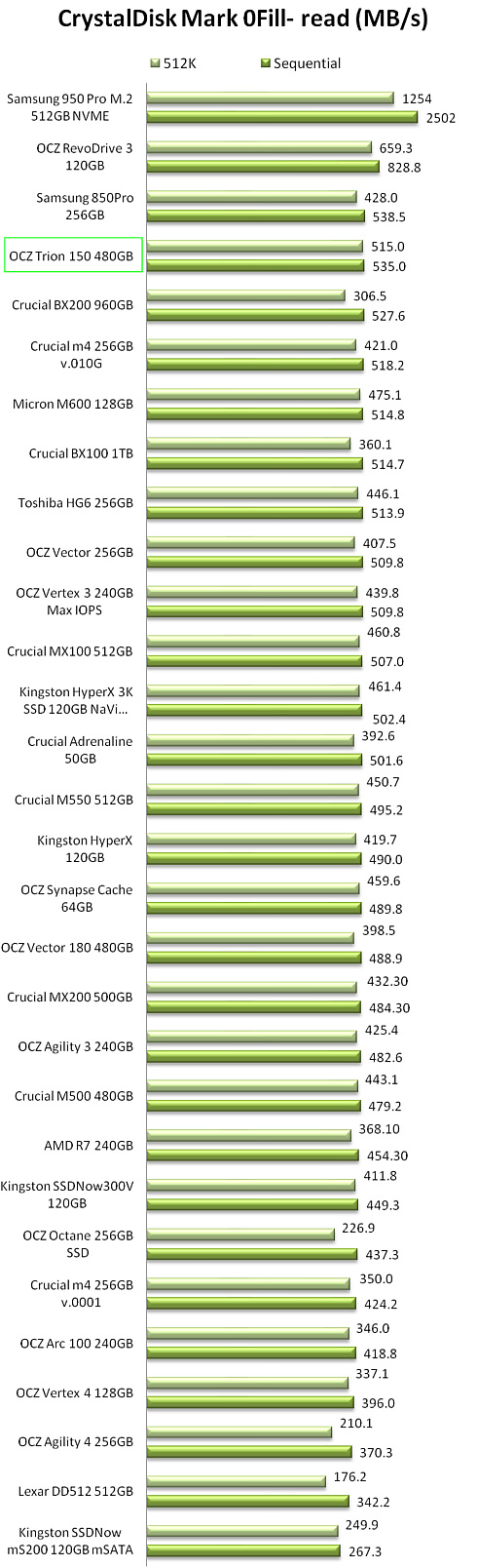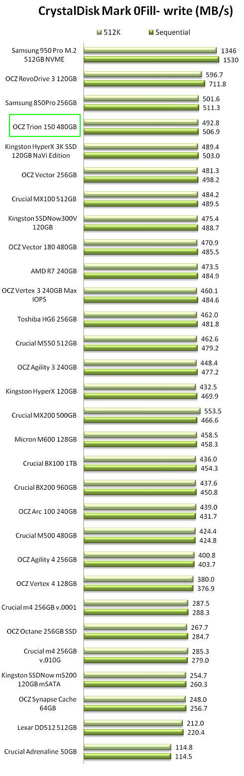 In both the sequential and 512K write benchmarks the Trion 150 480GB SSD was positioned among the top performers of the charts below: