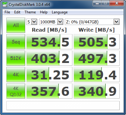 The OCZ Trion 150 480GB drive reached 534 MB/s read and 505MB/s write in the standard sequential write test. The Random 4K performance on the drive was 31.25 MB/s read and 119.4 MB/s write.