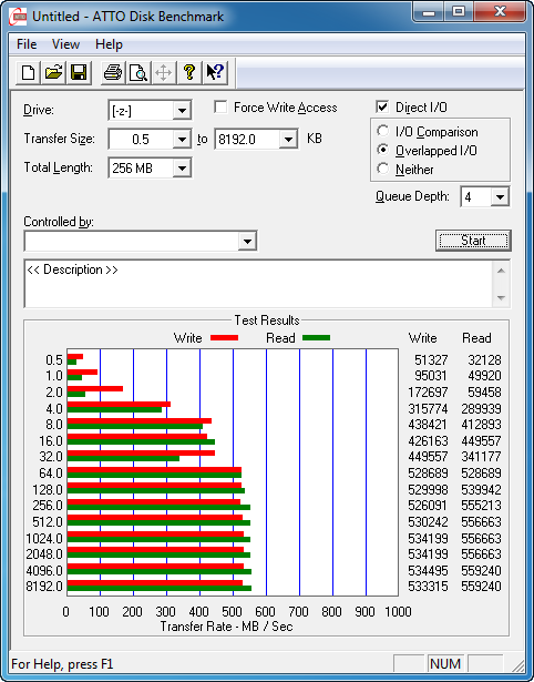 The next software we used was the ATTO Disk Benchmark. The tool measures storage systems performance with various transfer sizes and test lengths for reads and writes. The benchmark performs file transfers ranging from 0.5 KB to 8192 KB. ATTO can be adjusted to do overlapped I/O, in a variety of queue depths. We tested the SSD using the benchmark's default settings, using 256KB file length performance and QD4. ATTO probably gives the most accurate results for compressible read and write data.