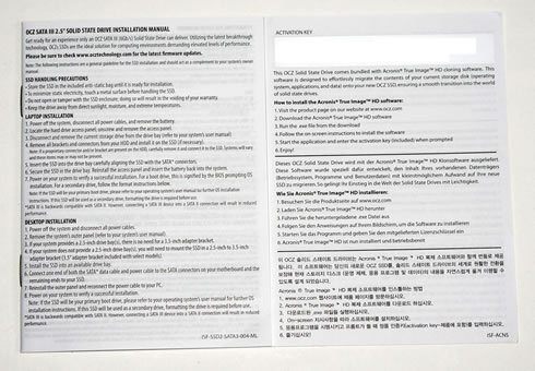 The package includes the OCZ Vector SSD, a 2.5 inch to 3.5 inch converter bracket, fixing screws, the quick start booklet and finally a serial key for Acronis True Image HD cloning software.