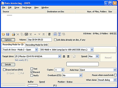 Originally, the Data Mastering window displays as far as the "Options" button shown above. By clicking on the "Options" button, the window opens further and reveals the two tab selections, Recording mode for CD and Recording mode for DVD. Here too there is a comprehensive and large array of options to set before burning. Again, ONES did not return any burning problems.