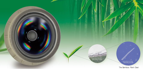 Panasonic used diaphragms made of resin containing bamboo fibers and bamboo charcoal. The diaphragm in the loudspeaker now uses an additional bamboo-derived material - hard, needle-shaped plant opals in bamboo leaves, resulting to accurate reproduction of audio as close as posible to the original sound, and less distortion compared to the company's existing loudspeakers.