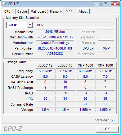 The Crucial PC3-12800 6GB kit supports the JEDEC timings for the 593MHz, and 667Mhz at 1.50V as well as the XMP compatible timings for 800MHz. While the product seems to support DDR3-1600 with CL8 @ 1.65V, the CPU-Z gives CL7 for 800MHz also, which looks very promising. We will see more on this later in the tests.