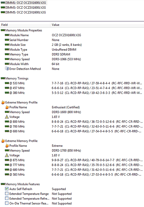 The OCZ PC3-12800 6GB kit supports the JEDEC timings for the 533MHz and 610Mhz with 1.50V, according to CPU-Z. The memory also offers XMP compatible timings for 500MHz and 800MHz. The DDR3-1600 comes with 1.65V and CL8.