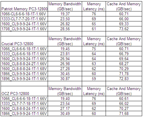 In the table below you can find the results of the Sisoft Sandra given for each of the three PC3-12800 rated 2GBx3 kits. Obviously the higher numbers indicate a better performance at least for Memory Bandwidth and Cache&Memory Index.