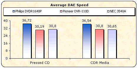 As seen in the graph above, the superiority of the Philips drive is significant. Note that the Pioneer and NEC drives support up to 40x CAV DAE.