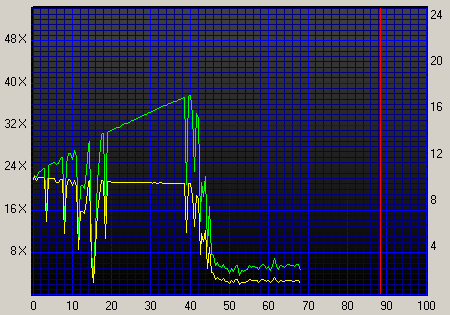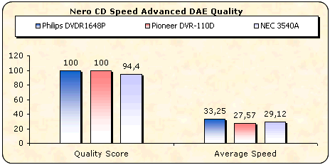 Once again the Philips drive reached a maximum of 48X DAE speed, and as was expected, its average reported speed was higher than the Pioneer and NEC drives. Not only is it fast, but the drive also managed to obtain a perfect quality score of 100.
