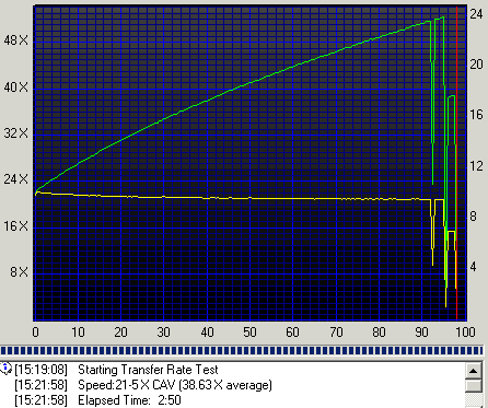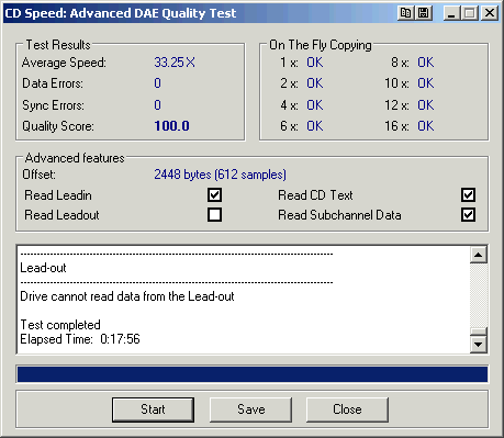The Philips DVDRW1648P supports up to 48X CAV DAE speed, which is the fastest available speed on the market today. The following results were reported when using Exact Audio Copy software.