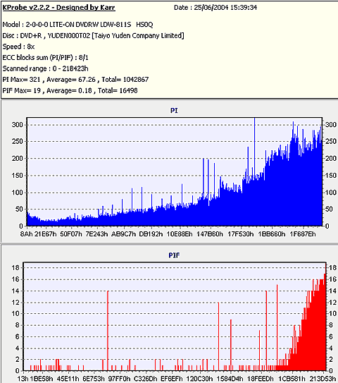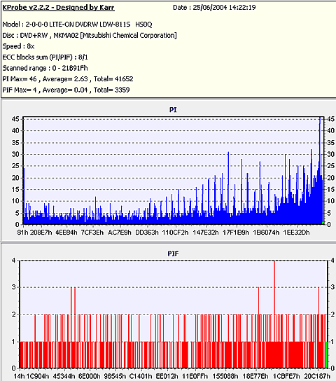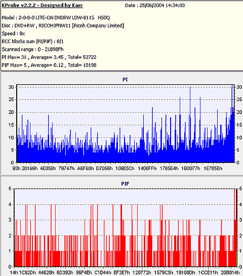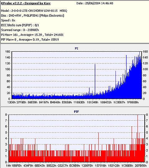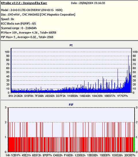 Kprobe reported quite acceptable PI/PIF mesurements for almost all written media with the Philips writer. However there were a few cases with increased PI/PIF values and one with error. As for the servo errors with DVD+RW media, it is not a problem of the Philips drive but probably a bug from Kprobe.