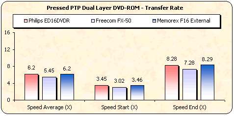 With a PTP DVD-ROM disc, the starting point of the two layers is at the inner part of the disc. The drive reads from the beginning of each layer (inner part) progreesing towards the outer part of the disc. The Philips and Memorex drives were the fastest with again the very similar performance.