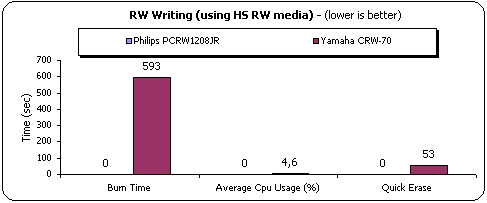 Philips PCRW1208JR refused to write in a HSRW disc, when we used Nero or CloneCD. The drive freezes when the drive accesses the CD, and what we have to say is that it is possibly a drive firmware bug. The Yamaha CRW-70 needs 593 seconds to write the HS-RW ,at 8x, and 53 seconds to "quickly" erase it.