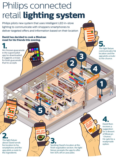 Philips is piloting an in-store lighting system for that communicates with your smartphone to send you special offers and information based on your location.