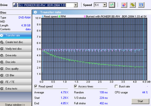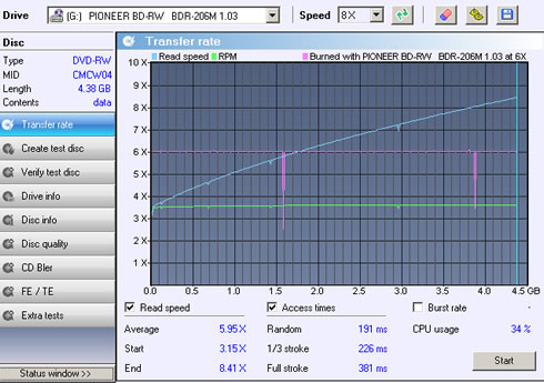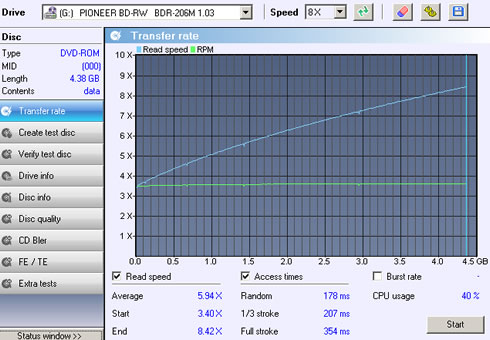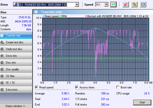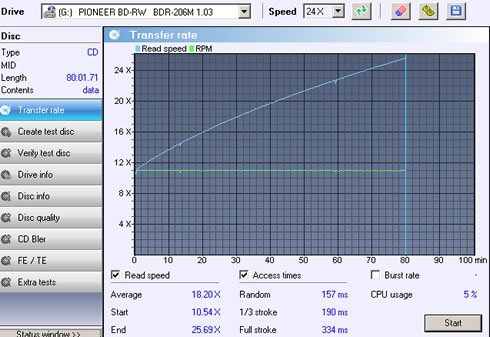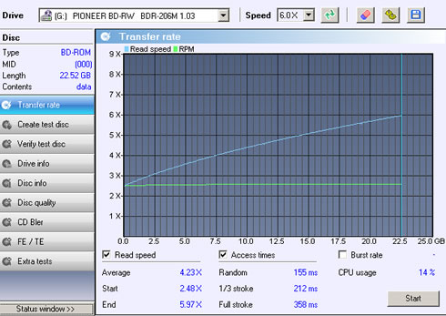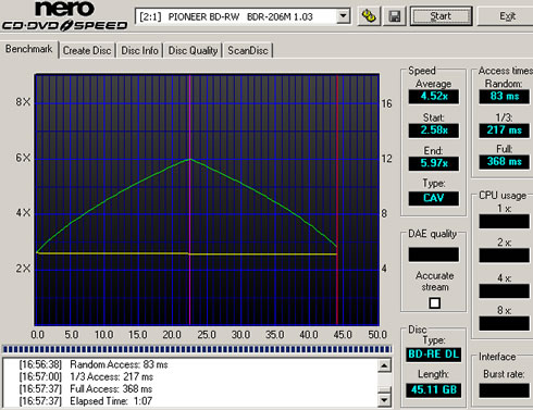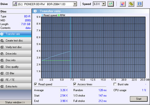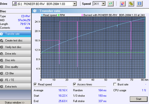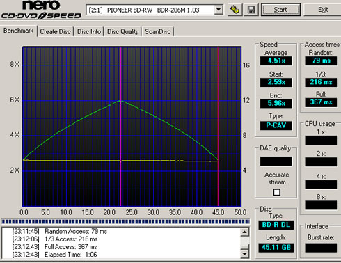 For our CD/DVD/BD and Blu-ray transfer rate tests we used the OptiDrive Control v1.51 utility and a set of data and audio CD-R/RW/ROM, DVD-R/+R/-RW+RW/ROM as well as BD-R and BD-RE media. Here we test the maximum reading speed of the Pioneer drive for each type of disc.