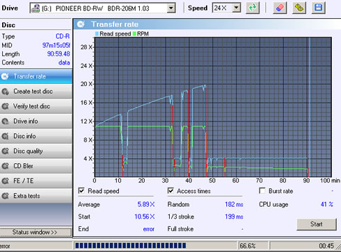 The drive managed to read a 99 min data disc but still the Opti Drive Control software returned errors during the access time tests.
