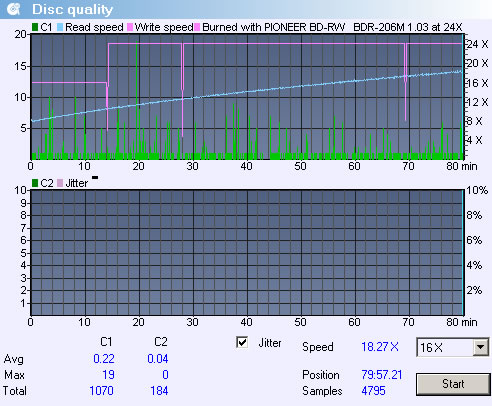 The specific disc was measured using the Opti Drive Control software since our Quantized system does not support measurements with CD-RW discs. The result is good and no C2 errors were reported.