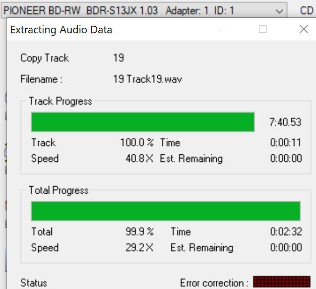 We used ExactAudioCopy with a good shaped Audio disc and measured the "ripping" AudioCD performance under "Secure" and "Burst" Modes. The Pioneer BDR-S13U-X can rip AudioCDs up to 11.4X at Secure mode.