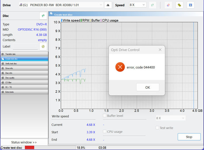 The drive can write up to 8X with specific media and used CAV writing strategy. However we did faced a strange issue with OptiDriveControl, where at the same point, the drive dropped speed and writing test failed.
