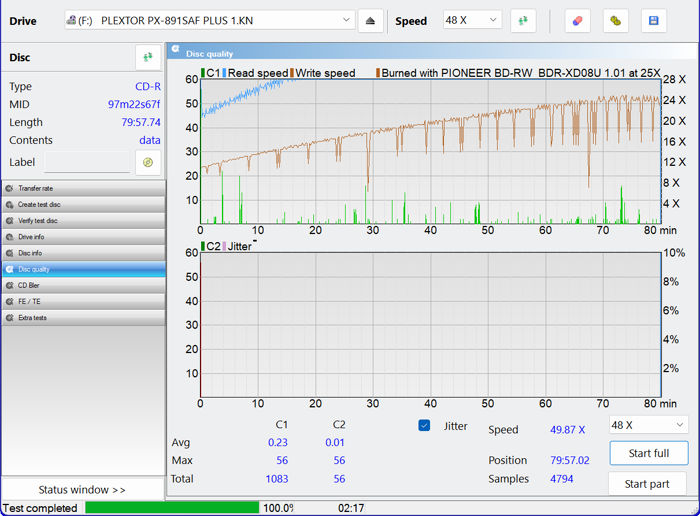 Using the Disc Quality measurements from the same drive, we can see good C1 errors with some indication of C2 spikes.