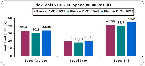 Using CD Speed 0.80, we can see that the DVD-U05S model is again faster than the DVD-105S model.
