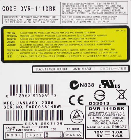 The device was connected to our test PC and was identified as the "PIONEER DVD-RW DVR-111D" under WinXP. The drive came with firmware version 1.06 installed, which at the time of the review was the latest available.