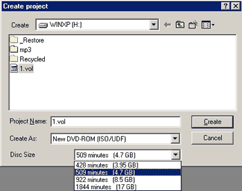 After we select a project, you must save the name of your DVD project and select the desired DVD size (4.7GB):