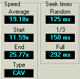 On the seek time test for the same cd-r media, resulting times were lower for the Random and 1/3 modes test in comparison with the pressed disc. However, the full seek time increased (292ms).