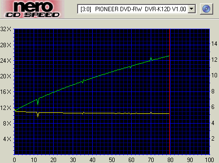 For this test we used 10x HS-RW media from Ricoh. The drive read the disc at 24.69x and the seek times were not significantly different from those for CD-R/ROM.