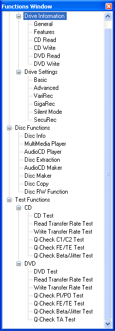 - The functions window shows all available functions used for retrieving information on the drive or disc, the players and recording modules and also includes the test functions.