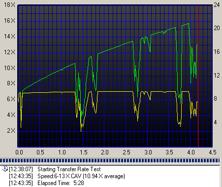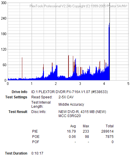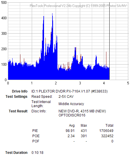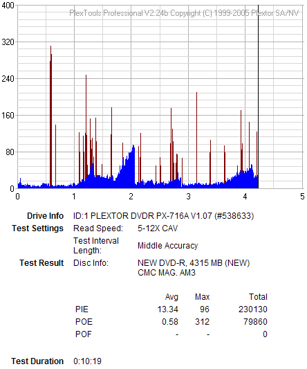 In general, a "perfect" disc should have a smooth reading curve, very low PIE/POE and zero (0) POF error rates. Most times however, even though a disc has very low PIE/POE error rates, the reading curve may not be smooth containing dropoffs. Due to the fact that we oversped the reading capabilities of the LiteON SOHD-167T, such drops are expected, especially near the outer area of the disc.