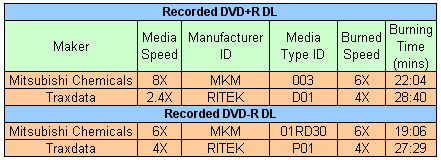 This is new DVD-R DL media from Traxdata, certified for 4X writing, with id RITEK P01. The Plextor PX-716SA burned it at its certified speed of 4X in 27:29min. Note that not many drives at the time of this review, support 4X with this specific media.