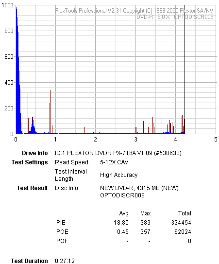 In general, a "perfect" disc should have a smooth reading curve, very low PIE/POE and zero (0) POF error rates. Most times however, even though a disc has very low PIE/POE error rates, the reading curve may not be smooth containing dropoffs. Due to the fact that we oversped the reading capabilities of the LiteON SOHD-167T, such drops are expected, especially near the outer area of the disc.