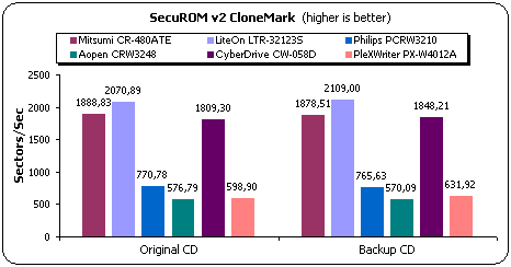The same scenery with the SafeDisc v2 protected CDs, with Plextor to lead with in the original CD test. With the backup medium, Mitsumi is slightly faster than Plextor with a 2049,43 sectors/sec reading performance.
