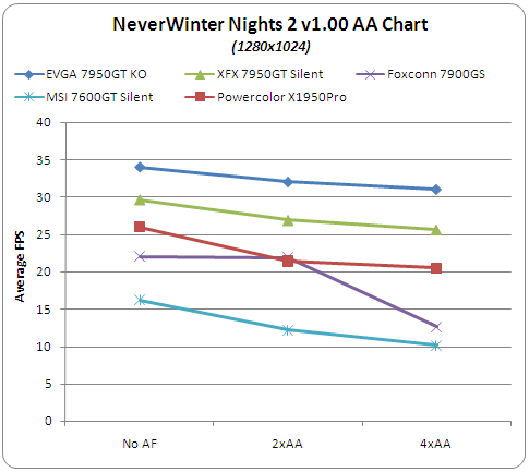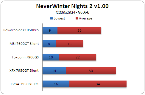 NeverWinter Nights2 is a "difficult" game, with all visual improvements enabled, even for the eVGA 7950GT KO. The card sustains an average of 34FPS. On the other hand, the PowerColor X1950Pro showed an average performance of 26FPS, but notice that the lowest framerate was 9. This is not very satisfactory, and you may need to drop some details for this game.