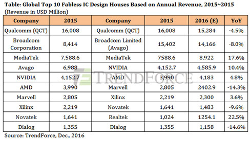 TrendForce further notes that the two major Chinese fabless IC design houses HiSilicon and Spreadtrum have not released their financial results to the public. For that reason, these two companies are excluded from TrendForce's 2016 ranking. Nonetheless, TrendForce?s analysis indicates that HiSilicon and Spreadtrum are expected to do well revenue-wise this year on account of the strong growth in China?s smartphone market.