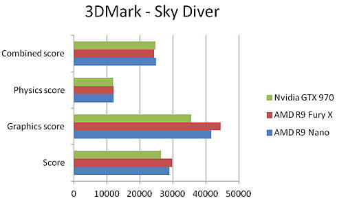 At the Sky Diver and Cloud Gate becnhmarks, the differences among the total scores of teh cards were smaller. The Radeon R9 Nano scored bettwe than the GeForce GTX 970 by 10 ~ 17% (graphics score).