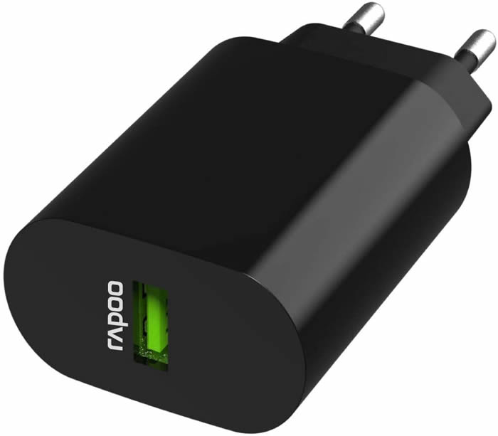 The Rapoo XC140 and the XC145 products are the same, their only difference is the power plug-type, XC140 aims for the European market, while the XC145 aims only for the UK market. Their retail boxes are exactly the same. At the front users will read all the needed information as the Qi standard, the Qualcomm 3.0 quick charge technology and several compatible devices (Samsung Galaxy S, Note series, Iphone 8, 11 and Huawei and other Qi-compatible devices).