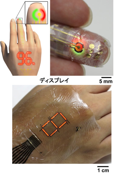 By integrating green and red PLEDs with OPDs, the researchers at the university of Tokyo fabricated an ultraflexible reflective pulse oximeter. The device unobtrusively measures the oxygen concentration of blood when laminated on a finger. On-skin seven-segment digital displays and color indicators can visualize data directly on the body.