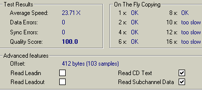 As you can see all drives got 100 (perfect) score in the Advanced DAE Quality tests. The Ricoh MP7125A gave the faster reading speed in this test with (23.71x). The Advanced test confirmed that the drive supports reading of CD-Text and SubChannel data: