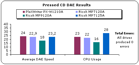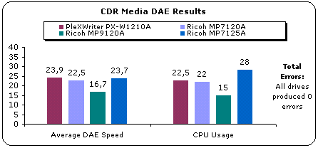 All tested drives supports 32x DAE (max) according to their specifications. From our tests the PX-W1210A still holds the fastest DAE performance in this category with 24x average ripping speed. The Ricoh MP7125A comes second with 23.2x: