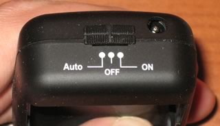 Looking at the device, on the front there are three LEDs which show device status. The Auto/on/off and power jack are located at the top.