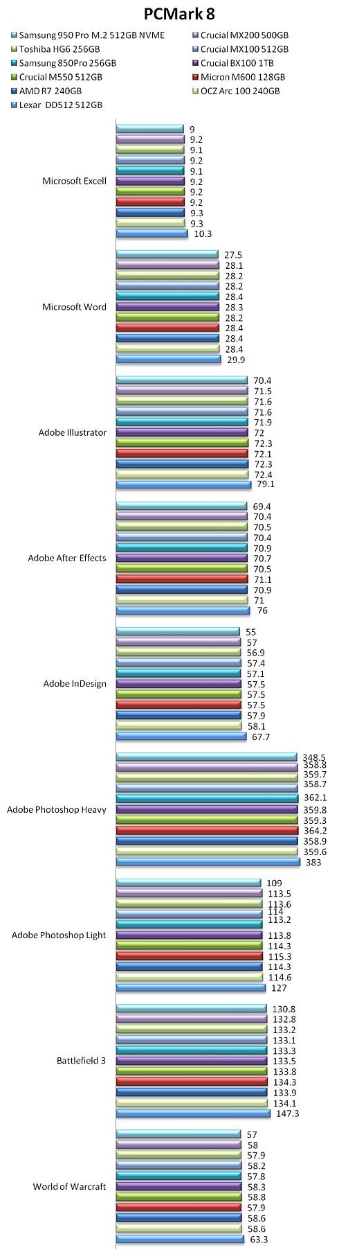 We continue with the PCMark 8 Storage benchmark, which uses traces recorded from Adobe Creative Suite, Microsoft Office and a selection of popular games. Unlike synthetic storage tests, the PCMark 8 Storage benchmark highlights real-world performance differences between storage devices.