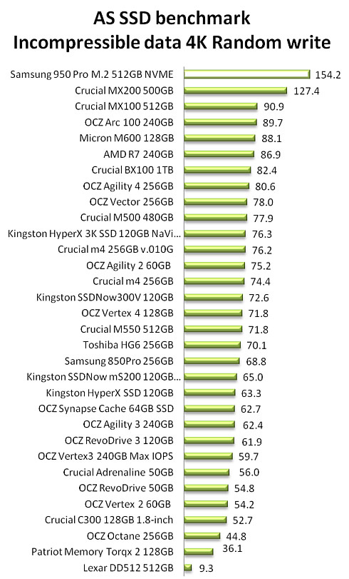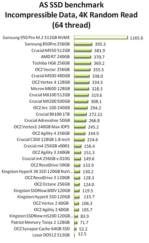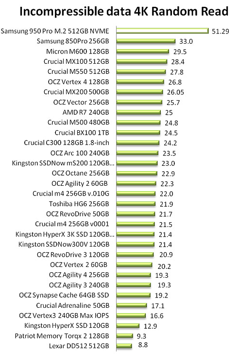 At the 4K random reading tests, the Samsung 950 Pro SSD reached the top of the chart below, with an average reading speed of 51.29 MB/s.