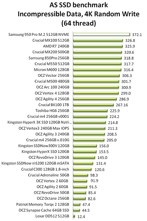 Multi-threaded requests for random reading of 4K incompressible files were not an issue for the Samsung 950 Pro512GB SSD, ranking first in both the read and write tests: