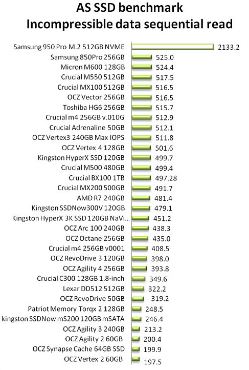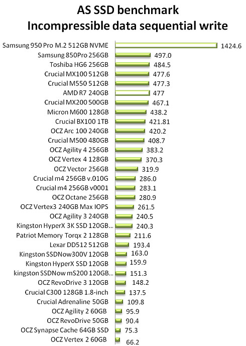 The 950 PRO's performance in sequential reading with incompressible test was the highest we have observed from an SSD so far, at 2133 MB/s. The same applies for sequential writing, where the drive wrote the incompressible files at 1424 MB/s (average).