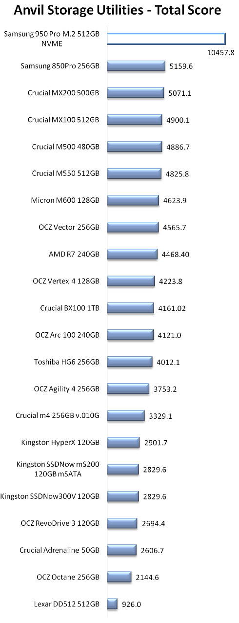 The next benchmark is the Anvil Pro, an ‘all inclusive’ storage utility. The software is tests transfer speeds as well as IOPS The IOPS tests can be configurable with preset testing scenarios for read (Seq 4MB, 4K, 4K QD4, 4K QD16, 32K and 128K), write (Seq 4MB, 4K, 4K QD4, 4K QD16) and mixed IO.