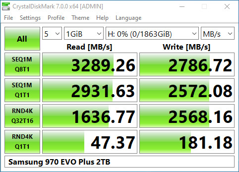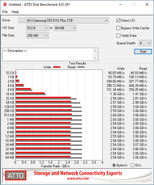 Passing to the newest ATTO Disk Benchmark 4.01.0F1, the Samsung 970 EVO Plus got similar performance as with the previous test.