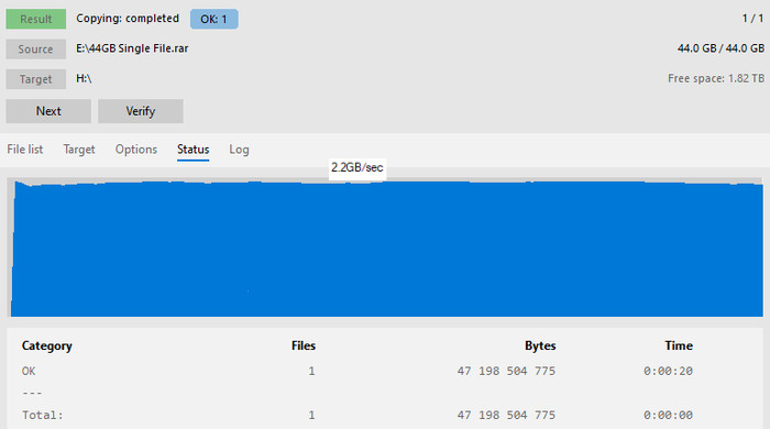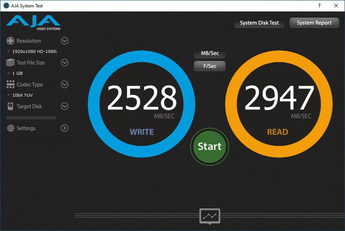 The AJA Test System shows a quick overview of the drive's reading/writing speed