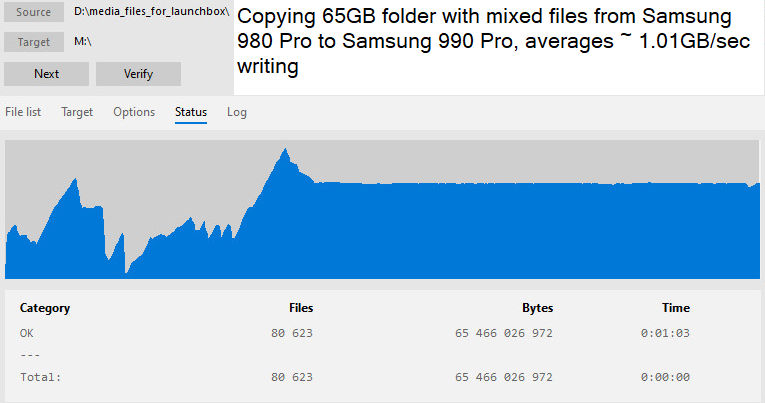 Passing to more real life tests, the Samsung 990Pro 1TB has better writing performance, or we should say more consistence. Below are the results we got after copying with TerraCopy from one NVME to the other and via versa.