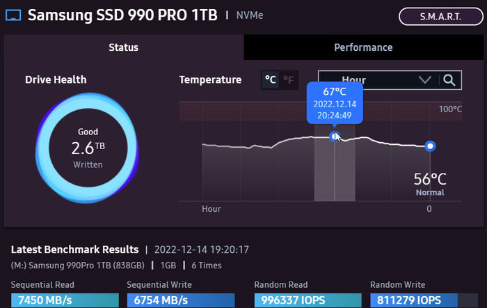 Getting some more information about the drive's Temperature/Performance from HWInfo64 software. The 990Pro 1TB seems to reach a max of 67 Celsius under our stress test, as the Samsung Magician indicates. The HWInfo64 has reported three sensors with up to 77 Celsius, which may be wrong. Note that the drive has the stock Asus motherboard NVME heatsink that helps reduce heat..